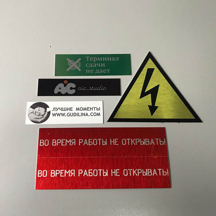 Производим таблички и шильды в любом размере и форме. Также предлагаем изготовление алюминиевых табличек с логотипами, QR-кодами, серийными номерами. Варианты крепления — скотч 3М, винты, декоративные держатели.